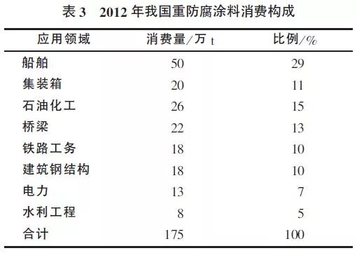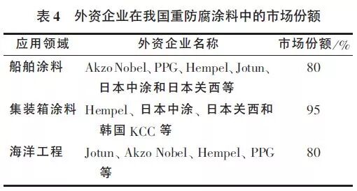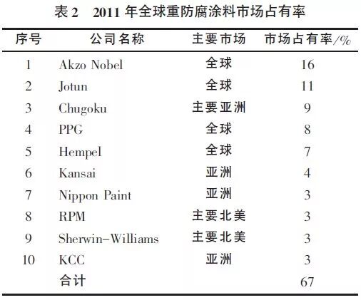腐蚀是金属、混凝土、木材等物体受周围环境介质的化学作用或电化学作用而损坏的现象。腐蚀是人类的大敌。据相关统计, 全世界每年因腐蚀造成的经济损失高达1 万亿美元, 约为地震、水灾、台风等自然灾害造成经济损失总和的6 倍,占各国国民生产总值的2%~4%。我国每年因腐蚀造成的经济损失达1.2 万亿元, 超过很多省市一年的GDP, 可约建441 个鸟巢、7 个三峡工程、46 条青藏铁路, 损失之大令人咂舌。腐蚀在给经济造成巨大损失的同时, 还会带来资源的巨大消耗,加剧环境污染, 因此防腐蚀研究越来越受到世界各国的重视。在各种防腐蚀措施中, 以防腐涂料来防腐蚀最为经济、实用和方便。 在涂料行业中, 防腐涂料的产量是仅次于建筑涂料的第二大涂料品种, 一般分为常规防腐涂料和重防腐涂料。常规防腐涂料是指在一般环境条件下, 对金属等基材起防腐蚀作用、延长其使用寿命的涂料;重防腐涂料是相对常规防腐涂料而言, 是指能在相对苛刻腐蚀环境里应用、并具有能达到比常规防腐涂料更长保护期的一类防腐涂料。重防腐涂料是防腐涂料中威力最大、最具代表性和影响力、且最有发展潜力的一类防护涂料, 也是衡量一个国家涂料工业发展水平的重要标志之一。重防腐涂料具有两个显着特征:一是能在苛刻条件下使用, 并具有长效防腐寿命, 重防腐涂料在化工大气和海洋环境里, 一般可使用10 年或15 年以上, 即使在酸、碱、盐和溶剂介质里, 在一定温度条件下, 也能使用5 年以上;二是厚膜化, 一般防腐涂料的涂层干膜厚度为100 μm或150 μm 左右, 而重防腐涂料干膜厚度则在200 μm或300 μm 以上, 还有500~1 000 μm, 甚至高达2 000 μm。 重防腐涂料以其卓越的防护性能, 主要应用在船舶、集装箱、石油化工、建筑钢结构、铁路、桥梁、电力和水利工程等诸多关乎国家发展战略和经济命脉的重要领域, 重防腐涂料对经济发展起着非常重要的保驾护航作用。 1 重防腐涂料发展状况 1.1 国外发展状况 2011 年全球重防腐涂料消费量为362 万t,价值120 亿美元。工业防护是其最大消费领域,占总消费量的53%;船舶涂装次之, 占35%;集装箱涂装占7%;海洋设施防护占5%。未来随着全球经济一体化进程的加快, 海运业将快速发展, 将由此带动重防腐涂料的需求增长。 预计到2016 年, 全球重防腐涂料的需求量将达到428 万t, 2011—2016 年年均增长3.4%, 其中海洋设施和集装箱领域对重防腐涂料的需求增长较快。全球重防腐涂料消费构成及需求预测见表1。 重防腐涂料因技术含量较高, 进入门槛也较高(如进入船舶涂料、集装箱涂料等领域需要取得国际相关资质认证), 因此成为涂料工业市场集中度相对较高的一个领域, 特别是高端市场几乎被国际大公司所垄断。荷兰Akzo Nobel、挪威Jotun、日本Chugoku、美国PPG、丹麦Hempel 五大公司, 采取全球化经营战略, 其全球市场占有率超过50%;世界排名前十公司全球市场占有率高达67%。2011 年全球重防腐涂料市场占有率见表2。 1.2 国内发展状况 我国是世界第一大涂料产销国, 同时也是重防腐蚀涂料第一大产销国。2012 年我国涂料产量1 272 万t, 进口量17.45 万t, 出口量16.65 万t,消费量1 273 万t, 其中重防腐涂料消费量为175万t, 占国内涂料总消费量的13.7%, 占世界重防腐涂料总消费量的40%以上。我国是世界船舶和集装箱生产大国, 近年石油化工、铁路交通、新能源、基础设施建设等更是蓬勃发展, 为重防腐涂料提供了广阔的市场空间。2012 年我国重防腐涂料消费构成见表3。 重防腐涂料是我国涂料行业对外开放最早、国际化程度最高的领域。自20 世纪80 年代中期,世界船舶、集装箱产业开始向我国转移起, 国际知名重防腐涂料生产商丹麦Hempel、英国IP、挪威佐敦、日本中涂、美国PPG、荷兰Akzo Nobel、韩国KCC 等就纷纷来我国投资设厂, 完成了本地化生产和战略布局, 从而形成了我国重防腐涂料高端市场由外资(含合资) 主导, 低端由内资企业为主的竞争格局。在技术要求较高的集装箱和船舶涂料领域, 外资和合资企业的产品分别占据了我国95%和80%的市场份额;海上石油钻井平台和海上设施所用的重防腐蚀涂料市场100%被Akzo Nobel、PPG、Hempel、Jotun 和日本关西等公司所占领;海洋工程重防腐涂料领域Jotun 公司占有60%的市场份额;可以说海洋涂料(包含船舶涂料、集装箱涂料、海上设施及海洋港口设施涂料等) 是一个不属于中国的中国市场。外资涂料企业在我国重防腐蚀涂料各领域中的市场份额见表4。 近年来, 一些内资企业依靠自主创新、质优价廉的产品和及时周到的服务, 在重防腐涂料诸多领域也开辟出自己的一片天地。上海涂料公司麾下的开林造漆厂作为国营企业的代表, 在钢结构涂料和船舶涂料领域占有一定市场份额, 曾为上海虹桥枢纽工程提供了1 800 t 重防腐蚀涂料;江苏兰陵化工集团公司作为国内最大的民营重防腐蚀涂料企业, 重防腐蚀涂料销售总额超过40 亿,其重防腐涂料应用工程范例遍布海内外:国内-天津100 万t 乙烯工程、上海高桥石化总厂50 万m2、北京“鸟巢” 工程、国家大剧院、上海东方艺术中心等等;国外-印尼苏加诺机场、法国斯坦因公司锅炉支架、坦桑尼亚体育场等等;还应该提到的是北京志盛威华化工有限公司开发了高新重防腐蚀涂料, 使重防腐涂料的应用范围获得重大突破, 其产品应用于中海油全球最大的坐底式33 号